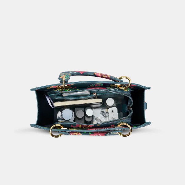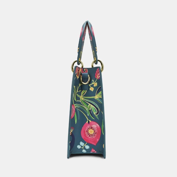 Complete your afternoon or evening look with this gorgeous Satchel. The design and compartments allow you to carry all your essentials in an organised fashion. Made from high quality and soft material, this handbag features a well-stitched inner lining for easy accessibility and storage. This handbag features a large compartment and multi-utility pockets that offer space for a phone, keys, wallet, and most importantly, hand sanitizer!. This is the perfect bag for any trendy woman. Best for gifting to your girlfriend, wife or friend. Functional and trendy, this premium bag from Lavie will carry all your essentials for your night out or even a day event. Special Features: Anar Mor print with a hand painted look of peacock and anar motifs., Premium metal hardware, Spacious Compartment. Product Dimensions & Care: Dimensions: 26L X 9W X 21.5H cm Care Instruction: Wipe with a damp cloth.